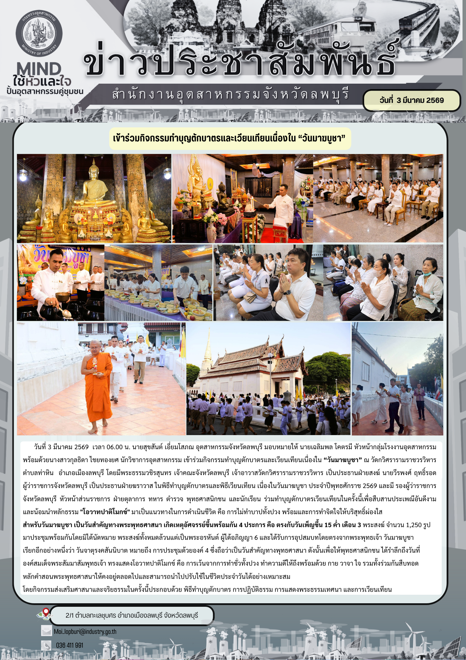 วันที่ 3 มีนาคม 2569 เวลา 06.00 น. นายสุขสันต์ เอี่ยมโสภณ อุตสาหกรรมจังหวัดลพบุรี มอบหมายให้ นายเฉลิมพล โคตรมี หัวหน้ากลุ่มโรงงานอุตสาหกรรม พร้อมด้วยนางสาวกุลธิดา ไชยทองยศ นักวิชาการอุตสาหกรรม เข้าร่วมกิจกรรมทำบุญตักบาตรและเวียนเทียนเนื่องใน “วันมาฆบูชา” ประจำปีพุทธศักราช 2569 ณ วัดกวิศรารามราชวรวิหาร ตำบลท่าหิน อำเภอเมืองลพบุรี จังหวัดลพบุรี โดยมี พระธรรมวชิรสุนทร เจ้าคณะจังหวัดลพบุรี เจ้าอาวาสวัดกวิศรารามราชวรวิหาร พระอารามหลวง เป็นประธานฝ่ายสงฆ์ และนายวีรพงศ์ ฤทธิ์รอด ผู้ว่าราชการจังหวัดลพบุรี เป็นประธานฝ่ายฆราวาส พร้อมด้วยรองผู้ว่าราชการจังหวัดลพบุรี หัวหน้าส่วนราชการ ตุลาการ ทหาร ตำรวจ พลเรือนพุทธศาสนิกชน และนักเรียน เข้าร่วมกิจกรรม