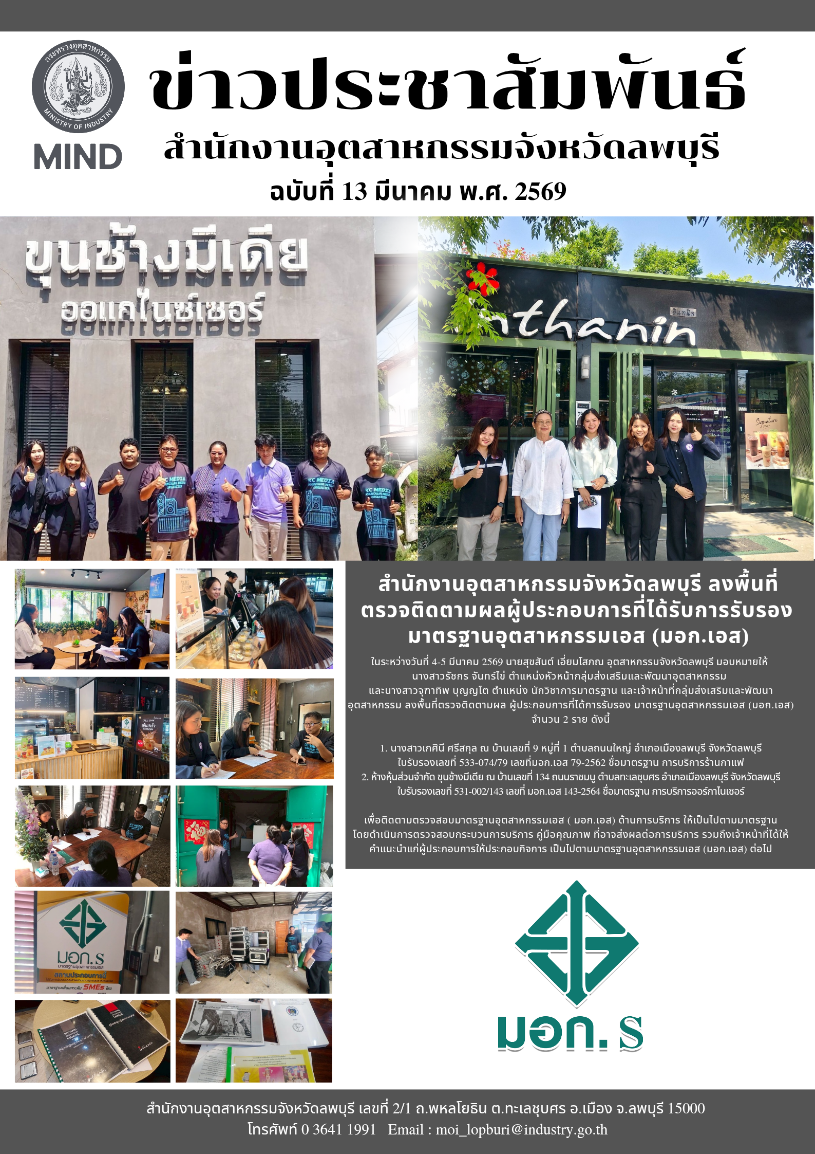 วันที่ 4-5 มีนาคม 2569 นายสุขสันต์ เอี่ยมโสภณ อุตสาหกรรมจังหวัดลพบุรี มอบหมายให้ นางสาวรัชกร จันทร์ไข่ หัวหน้ากลุ่มส่งเสริมและพัฒนาอุตสาหกรรม และนางสาวจุฑาทิพ บุญญโต นักวิชาการมาตรฐาน และเจ้าหน้าที่กลุ่มส่งเสริมและพัฒนาอุตสาหกรรม ลงพื้นที่ตรวจติดตามผล ผู้ประกอบการที่ได้การรับรอง มาตรฐานอุตสาหกรรมเอส (มอก.เอส) จำนวน 2 ราย ดังนี้