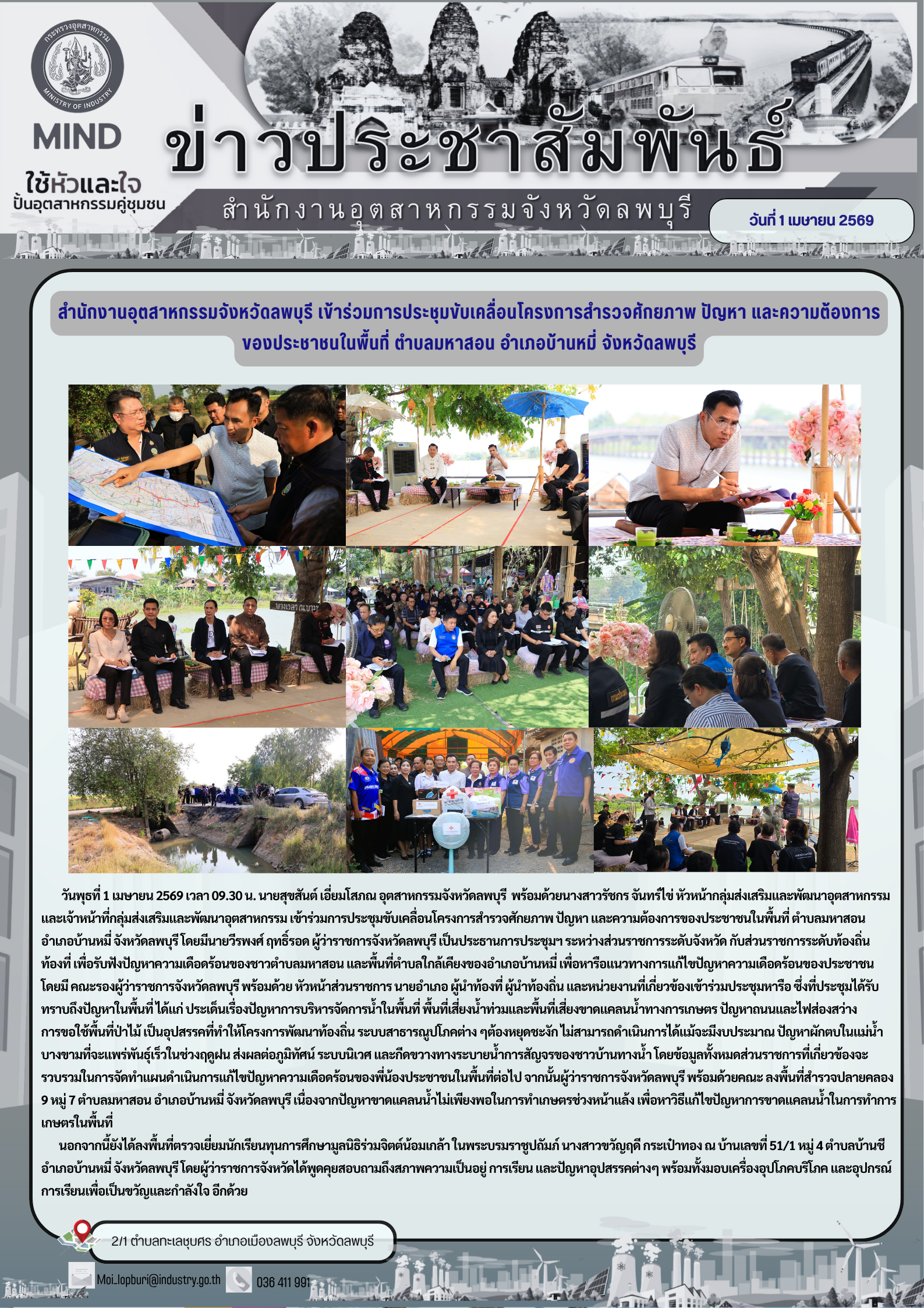 วันที่ 1 เมษายน 2569 เวลา 13.30 น. นายสุขสันต์ เอี่ยมโสภณ อุตสาหกรรมจังหวัดลพบุรี พร้อมด้วย นางสาวรัชกร จันทร์ไข่ หัวหน้ากลุ่มส่งส่งเสริมและพัฒนาอุตสาหกรรม เข่าร่วมการประชุมขับเคลื่อนโครงการสำรวจศักยภาพ ปัญหา และความต้องการของประชาชนในพื้นที่ ระหว่างส่วนราชการระดับจังหวัด กับส่วนราชการระดับท้องถิ่น ท้องที่ เพื่อรับฟังปัญหาความเดือดร้อนของชาวตำบลมหาสอน และพื้นที่ตำบลใกล้เคียงของอำเภอบ้านหมี่ เพื่อหารือแนวทางการแก้ไขปัญหาความเดือดร้อนของประชาชน โดยมี นายวีรพงศ์ ฤทธิ์รอด ผู้ว่าราชการจังหวัดลพบุรี เป็นประธานการประชุม พร้อมด้วยคณะรองผู้ว่าราชการจังหวัดลพบุรี หัวหน้าส่วนราชการ นายอำเภอ ผู้นำท้องที่ ผู้นำท้องถิ่น และหน่วยงานที่เกี่ยวข้องเข้าร่วมประชุมหารือ