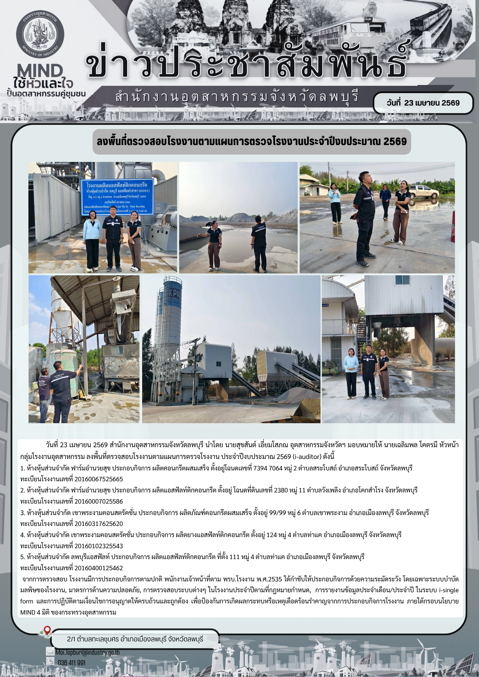 วันที่ 23 เมษายน 2569 นายสุขสันต์ เอี่ยมโสภณ อุตสาหกรรมจังหวัดลพบุรี มอบหมายให้ นายเฉลิมพล โคตรมี หัวหน้ากลุ่มโรงงานอุตสาหกรรม ลงพื้นที่ตรวจสอบโรงงานตามแผนการตรวจโรงงาน ประจำปีงบประมาณ 2569 (i-auditor) ดังนี้